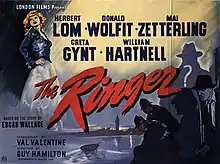 The Ringer is a 1952 British mystery film directed by Guy Hamilton and starring Herbert Lom, Donald Wolfit, Mai Zetterling, Greta Gynt, William Hartnell, and Denholm Elliott.[1] It was Hamilton's directorial debut and the third English-language sound version of Edgar Wallace's 1929 play, which in of itself was based on his 1925 novel The Gaunt Stranger. The previous adaptations had come in 1928 (silent), 1931, 1932 (Germany-Austria), and 1938.[2][3][4]