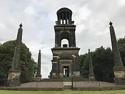 The mausoleum is built of ashlar sandstone.[2] It is a 90 feet (27 m) high[1] three-stage monument, with obelisks at the four corners.[2] Niches in the walls support busts of eight of the Marquis's closest friends, all luminaries of the Whig hierarchy; Admiral Viscount Keppel, Edmund Burke, Sir George Savile, Charles James Fox, The Duke of Portland, John Lee, Lord John Cavendish and Frederick Montagu.[2] The original busts by Nollekens, Carrachi, John Bacon and William Hickey have now been replaced by casts. The large sarcophagus which can be seen from the exterior reposing on the first storey is vacant. Pevsner described it as "an outstandingly fine and noble structure".[5] It is a Grade I listed building.[2]