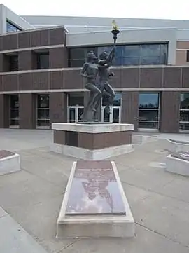 The bronze sculpture depicts one male and one female runner wearing shorts, tank tops, and tennis shoes. Both figures are carrying torches. The work measures approximately 15 x 8 x 8 ft, and rests on a polished 5-sided granite base that measures approximately 7 x 12 x 12 ft. There are plaques with inscriptions on each side of the base.[1]