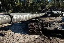 The phrase on a tank left by Russian army while retreating from Kupiansk, Ukraine
