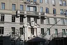 The facade contains metal, stone, and terracotta decorations.[6] These details include pilasters, engaged columns, rounded and triangular broken pediments, and balustrades, as well as smaller motifs such as roundels, scrolls, urns, cartouches, garlands, and consoles.[28] The lowest three stories of the facade are made of rusticated blocks of limestone, while the rest of the building is clad with beige brick.[28][22][21] The limestone blocks on the first and second stories are vermiculated.[28] Above the base, there is a small amount of terracotta ornament, which is used to emphasize the otherwise plain brick facade.[6][40] The ornament on the upper stories is oversized, allowing it to be seen from the ground.[40]