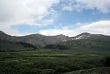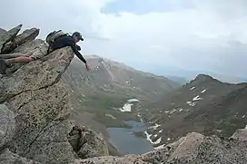 The Sawtooth is a jagged arête joining Mount Bierstadt to (eventually) Mount Blue Sky in the Front Range of central Colorado.[4] The three points along this arête resemble the teeth of a saw, leading to its name. The southeast wall of the arête is the head of the cirque above Abyss Lake, while its northwest wall is the cirque at the head of a valley above Guanella Pass. The northeast end of the sawtooth joins directly to the shoulder of Mount Spalding, from which a second (and slightly less abrupt) arête leads southeast to Mount Blue Sky. This second arête divides the glacial valley of Abyss Lake to the southwest from the cirque of Summit Lake to the northeast.