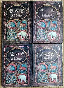 The Sea of Fertility (豊饒の海, Hōjō no Umi) is a tetralogy of novels written by the Japanese author Yukio Mishima. The four novels are Spring Snow (1969),[1] Runaway Horses (1969), The Temple of Dawn (1970), and The Decay of the Angel (1971).[2] The series, which Mishima began writing in 1964 and which was his final work, is usually thought of as his masterpiece. Its title refers to the Mare Fecunditatis, a lunar mare. The first English translated editions by Alfred A. Knopf and the Charles E. Tuttle Company featured cover designs by the graphic artist Joseph del Gaudio.