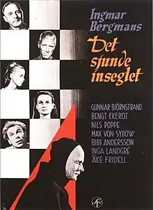 The Seventh Seal (Swedish: Det sjunde inseglet) is a 1957 Swedish historical fantasy film written and directed by Ingmar Bergman. Set in Sweden[3][4] during the Black Death, it tells of the journey of a medieval knight (Max von Sydow) and a game of chess he plays with the personification of Death (Bengt Ekerot), who has come to take his life. Bergman developed the film from his own play Wood Painting. The title refers to a passage from the Book of Revelation, used both at the very start of the film and again towards the end, beginning with the words "And when the Lamb had opened the seventh seal, there was silence in heaven about the space of half an hour."[5] Here, the motif of silence refers to the "silence of God," which is a major theme of the film.[6][7]