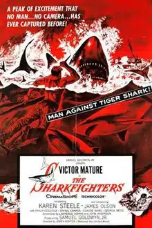 The Sharkfighters is a 1956 American adventure film starring Victor Mature, supported by Karen Steele, James Olson, and Claude Akins. Directed by Jerry Hopper, its fictional storyline is based on the invention of "Shark Chaser", an historical shark repellent developed by U.S. Navy researchers during World War II.[1][2]
