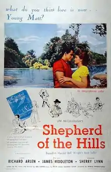 The Shepherd of the Hills is a 1964 American Western film directed by Ben Parker and starring Richard Arlen, James Middleton and Sherry Lynn.[1] It is based on Harold Bell Wright's 1907 novel The Shepherd of the Hills. The story was filmed previously in the silent era by author Wright himself in 1919, released on State Rights basis. It was filmed again, in The Shepherd of the Hills (1928 film), starring Molly O'Day at First National Pictures. Again remade as 1941, also color version starring John Wayne.