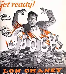 The Shock is a 1923 American silent drama film (a Universal Jewel) directed by Lambert Hillyer and starring Lon Chaney as a disabled man named Wilse Dilling.[1] The film was written by Arthur Statter and Charles Kenyon, based on a magazine story by William Dudley Pelley. This is one of the rare Lon Chaney films where he gets the girl. The film is readily available on DVD.[2]