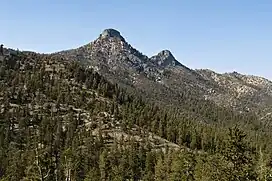 The Sisters is part of the Spring Mountains which are a subrange of the Great Basin Ranges. The mountain is located 30 miles (48 km) northwest of Las Vegas in the Spring Mountains National Recreation Area and on the boundary of the Mount Charleston Wilderness, on land managed by the Humboldt–Toiyabe National Forest.[2] Topographic relief is significant as the summit rises 2,000 feet (610 meters) above Lee Canyon in one mile (1.6 km). This mountain's toponym has been officially adopted by the U.S. Board on Geographic Names.[1]