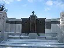 The eyes are drawn to the centered white marble stairs which lead up to the main part of the monument. At the top of the stairs is the dominating feature of the installation. Taft's oversized Classical female figure stands with her arms outstretched, clutching a laurel wreath in each hand. Behind her is an exedra which was designed by the architects Pond and Pond.[1] The exedra extends around the installation and to either side of the female sculpture are built-in benches. Above the benches are bronze plaques honoring veterans of the Civil War and the Spanish–American War;[3] above the individual war plaques is bronze plating that reads, "Ogle County Honors Her Sons." Flanking the dominant sculpture are two soldiers atop pedestals, one facing north and the other facing south. Tafts's soldiers were cut from marble obtained in the U.S. state of Georgia.[1] The Soldiers' Monument was constructed, on the approval of the Ogle County Board in 1916, for no more than $21,000. Today (2007), this example of the work of Lorado Taft is estimated to be worth over $1,000,000.[3]