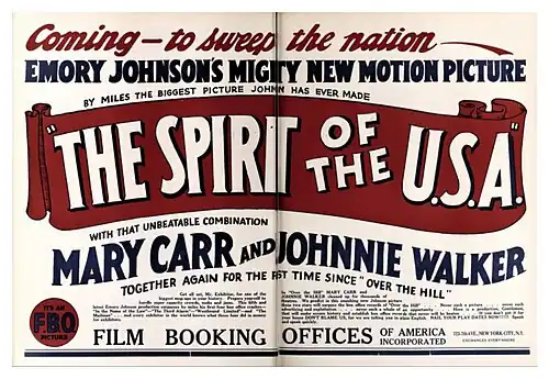 The Spirit of the USA is a 1924 American silent melodrama directed by Emory Johnson. FBO released the film in May 1924. The film's "All-Star" cast included Johnnie Walker and Mary Carr. Emilie Johnson, Johnson's mother, wrote both the story and screenplay. The Spirit of the USA was the fifth film in Johnson's eight-picture contract with FBO.[1][2]