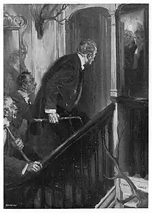 In the dressing room, Raffles is encouraged by the presence of the door's bolt. While he jimmies open a chest, Bunny wanders back to the bedroom, in time to see the rope-ladder be removed from below. Alarmed, Bunny retreats and tells Raffles. They pocket some jewel cases, and Raffles follows Bunny out the bedroom door. They are spotted by Guillemard and other men climbing the stairs. Raffles and Bunny hurry through the hallway and upstairs, into a room underneath the house's tower. They climb the stepladder and shut the trapdoor, hitting Guillemard.