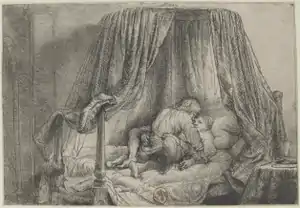 The State Bed (Dutch - Het Ledikant) is a 1646 print by Rembrandt in etching and drypoint. It is also known as Le Lit à la française (The French-style Bed), a title first given to it in Edme-François Gersaint's 1751 Catalogue raisonné de toutes les pièces qui forment l’œuvre de Rembrandt.