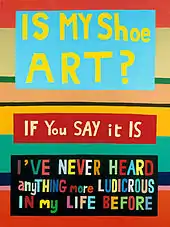 The second section is an analysis of a BBC2 Newsnight programme on 19 October 1999 hosted by Jeremy Paxman with Charles Thomson attacking that year's Turner Prize and artist Brad Lochore defending it. Thomson was displaying Stuckist paintings, while Lochore had brought along a plastic detergent bottle on a cardboard plinth. At one stage Lochore states, "if people say it's art, it's art". Paxman asks, "So you can say anything is art?" and Lochore replies, "You could say everything is art..." At this point Thomson, off-screen, can be heard to say, "Is my shoe art?" while at the same time his shoe appears in front of Lochore, who observes, "If you say it is. I have to judge it on those terms." Thomson's response is, "I've never heard anything so ludicrous in my life before."[12]