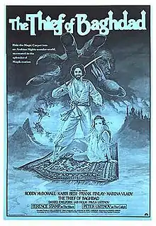 The Thief of Baghdad is a 1978 fantasy film directed by Clive Donner and starring Roddy MacDowall and Kabir Bedi. A British and French co-production, the film was released theatrically, except for the United States where it debuted on television.