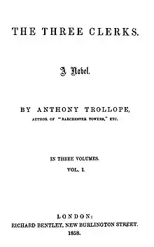 The Three Clerks (1857) is a novel by Anthony Trollope, set in the lower reaches of the Civil Service. It draws on Trollope's own experiences as a junior clerk in the General Post Office, and has been called the most autobiographical of Trollope's novels.[1] In 1883 Trollope gave it as his opinion that The Three Clerks was a better novel than any of his earlier ones, which included The Warden and Barchester Towers.[2]