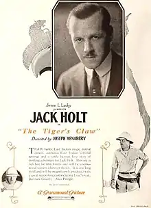 The Tiger's Claw is a 1923 American silent drama film directed by Joseph Henabery and written by Jack Cunningham. The film stars Jack Holt, Eva Novak, George Periolat, Bertram Grassby, Aileen Pringle, and Carl Stockdale. It was released on March 18, 1923, by Paramount Pictures.[1][2][3]