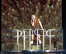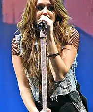 Cyrus performing "Party in the U.S.A." during the Wonder World Tour.