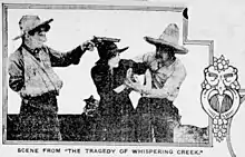 The Tragedy of Whispering Creek is a 1914 American silent short Western film directed by Allan Dwan and featuring Murdock MacQuarrie, Pauline Bush, and Lon Chaney.[2] Chaney expert Jon Mirsalis says Chaney also wrote the screenplay, based on a story by Elliott J. Clawson,[3] but the Blake book says the film's director Allan Dwan wrote the screenplay himself.[4] A print exists in the Deutsche Kinemathek film archive, making it Chaney's earliest surviving moving picture.[5] A still exists which shows Chaney in his role as "The Greaser".[6]