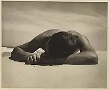 Dupain's preferred version of the Sunbaker had Harold Savage's hands clasped, but the sole surviving print of this version is in the Vandyke album.[3] [4] The image in the album did not appear until Max Dupain’s first monograph was published in 1948, after this, the negative was lost.[5] In the 1970s, Dupain printed a second version of the Sunbaker with Savage's hands unclasped.[5] Initially not widely known, the Sunbaker gained fame when it was used as the poster for the opening exhibition of the Australian Centre for Photography in 1975. Over the years its ongoing resonance through numerous publications, exhibitions, examinations and reinterpretations has elevated the image to iconic status.[6] There are thought to be about 200 signed prints of the better-known version where the right-hand lies with fingers extended on the sand.[5]