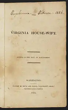 The Virginia House-Wife was first published in 1824; it was republished at least nineteen times before the outbreak of the Civil War.[1] The book was 225 pages long, included nearly 500 recipes,[2] and resulted from Randolph's "practical experience as keeper of a large establishment, and perhaps in the hope of further augmenting the family income."[3] The Virginia House-Wife is considered the first regional American cookbook.[1]