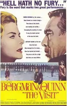 The Visit is a 1964 drama film directed by Bernhard Wicki, adapted by Ben Barzman and Maurice Valency from Friedrich Dürrenmatt's 1956 play of the same name. It stars Ingrid Bergman and Anthony Quinn, who also produced. Irina Demick, Paolo Stoppa, Hans Christian Blech, Romolo Valli, Valentina Cortese and Claude Dauphin play supporting roles.