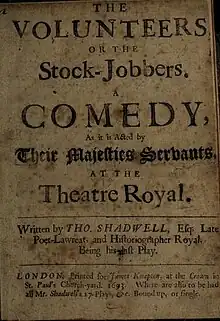 The Volunteers is a 1692 comedy play by the English writer Thomas Shadwell.[1] Shadwell completed the play shortly before his death and it was performed posthumously at the Drury Lane Theatre by the United Company. It is also known by the long title The Volunteers; or, The Stock-Jobbers.