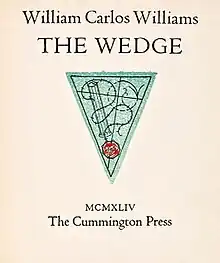 The Wedge is a 1944 book of poems by American modernist writer and poet William Carlos Williams. He assembled this collection in response to requests from American servicemen during World War II for a pocket-sized collection of his work to take into deployment with them. Despite the poet's inquiries and the nature of the requests that prompted him to approach them, several publishers rejected The Wedge. Their grounds for doing so were a perceived lack of literary quality and wartime shortages. The book was eventually handset printed by Henry Duncan and Wightman Williams at Cummington Press and bound surreptitiously on the premises and at the expense of one of the publishers who had previously rejected it. The book is dedicated to poet Louis Zukofsky, who helped Williams revise and rearrange the poems for publication.
