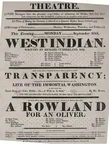 The West Indian is a play by Richard Cumberland first staged at the Drury Lane Theatre in 1771. A comedy, it depicts Belcour, a West Indian plantation owner, travelling to Britain. Belcour tries to overcome his father's lingering disapproval of him and marry his sweetheart Louisa.[1] Its hero, who probably owes much to the suggestion of David Garrick, is a young scapegrace fresh from the tropics, "with rum and sugar enough belonging to him to make all the water in the Thames into punch", a libertine with generous instincts, which prevail in the end. The early example of the modern drama was favorably received. Boden translated it into German, and Goethe acted in it at the Weimar court.[2]