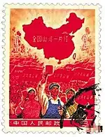 The Whole Country is Red is a Chinese postage stamp, issued on 24 November 1968,[1] which contained a problem with the design. The stamp features a map of China with the words "The Whole Country is Red" (Chinese: 全国山河一片红), with a worker, farmer, and soldier standing below with copies of Quotations from Chairman Mao, but Taiwan is not shaded red. The face value of the stamp is 8 fen.[2]