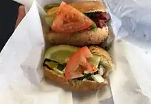 The establishment is known for its char-grilled food, especially its hot dogs and hamburgers (commonly called char-dogs and char-burgers).[5] A Wiener Circle char dog with "the works" is a grilled Vienna Beef hot dog on a warm poppy seed bun, topped with mustard, onions, relish, dill pickle spears, tomato slices, sport peppers and a dash of celery salt.