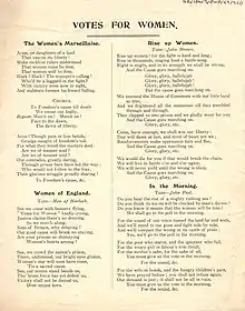 - ↑ "'Women's Marseillaise' Sung by Suffragettes". The Bridgeport Times and Evening Farmer. 2 May 1911. p. 8. Retrieved 19 January 2020 – via Newspapers.com.