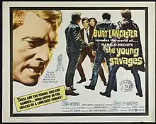 The Young Savages is a 1961 American crime drama film directed by John Frankenheimer and starring Burt Lancaster. It was written by Edward Anhalt from a novel by Evan Hunter.[2] The supporting cast includes Dina Merrill, Shelley Winters, and Edward Andrews, and The Young Savages was the first film featuring Telly Savalas, who plays a police detective, foreshadowing his later role as Kojak. Often categorized as a "thinking man's movie", it has received mixed reviews.[3] Aspects of the film are inspired by the real-life Salvador Agron case.