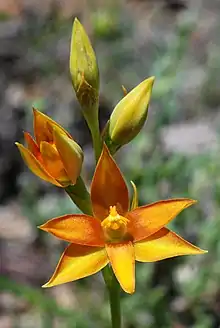 Thelymitra yorkensis, commonly called the York sun orchid[2] or bronze sun orchid,[3] is a species of orchid in the family Orchidaceae and is endemic to a small area in the south-west of Western Australia. It has a single erect, flat, leathery leaf and up to twelve crowded, cinnamon scented, orange-coloured flowers with reddish brown edges. The column has broad, deeply fringed, orange wings.