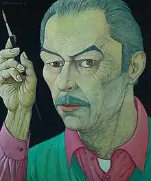 Largely self-taught and later, moving from impressionism to realism, his favourite subjects were women who were aged, wrinkled and creased, and on whom life had clearly left its mark. These were not people of flesh and blood, but sprang rather from his fertile imagination. The women in his paintings are monumental, being composed of sculptural elements placed against a restful background which does not distract the viewer. Through his caricature of the figure, reality is given a hardened and stylised alien appearance. This effect is enhanced by his combining of strongly contrasting colours with more calming tones.[2]