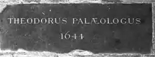 Many Parliamentarian graves in Westminster Abbey were exhumed on the orders of Charles II after the restoration of the monarchy in 1660, with the corpses suffering symbolic executions and their heads being impaled on spikes.[22] Theodore's grave was one of only seven Parliamentarian graves spared this fate, but whether it was because he was a simple soldier or because his grave was unmarked at the time is unknown.[23] The present marker for his grave was laid down by Arthur Penrhyn Stanley in the 19th century.[19] In his 2004 book on Westminster Abbey, historian Richard Jenkyns wrote that "those inclined to Romantic fantasy may toy with the notion that the Abbey also contains a rightful Emperor of Byzantium, the heir of Augustus and Constantine: that is, the Palaeologi were the last Byzantine dynasty, and a floor slab in the north transept records 'Theodorus Palaeologus 1644' ".[3]