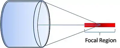 A spherically focused transducer is most sensitive to thermoacoustic waves originating along a line passing through its focal point. Time-of-flight information is used to estimate the thermoacoustic signal strength along this line. A 2D image can be assembled a line-at-a-time by translating the focused transducer laterally along a linear path. A 3D image can be built up by scanning the transducer along a rectilinear path within a 2D plane.[19] The ability to distinguish thermoacoustic signals along the line of focus (axial resolution) is superior to distinguishing thermoacoustic signals transverse to the line of focus (lateral resolution). For this reason the lateral spatial resolution is three- to four-times worse than the axial spatial resolution using this approach.