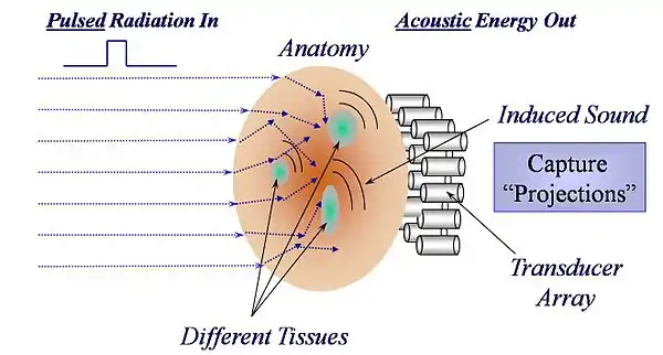Sound, which propagates as a pressure wave, can be induced in virtually any material, including biologic tissue, whenever time-varying electromagnetic energy is absorbed. The stimulating radiation that induces these thermally generated acoustic waves may lie anywhere in the electromagnetic spectrum, from high-energy ionizing particles to low-energy radio waves. The term "photoacoustic" (see photoacoustic imaging in biomedicine) applies to this phenomenon when the stimulating radiation is optical, while "thermoacoustic" is the more general term and refers to all radiating sources, including optical.