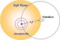 The typical acoustic detector is an ultrasound transducer, which is commonly made of a piezo-electric material that converts detected pressure to an electrical signal. Thermoacoustic waves are induced within the anatomy wherever absorption takes place, and the strength of these thermoacoustic waves is proportional to the energy absorbed within the tissue. Some of these waves propagate through the anatomy over some time interval (time-of-flight) before being detected by one or more of the acoustic transducers. The exact time-of-flight is proportional to the distance between an absorption site and a transducer, assuming for the moment that each transducer is a point detector. For any given time-of-flight, each transducer will receive the sum of the thermoacoustic waves originating at the same distance from the detector in question as is illustrated in Fig. 5. For this reason, ambiguity arises when attempting to localize an absorption site with a point transducer. A variety of strategies have been employed to mitigate this ambiguity.
