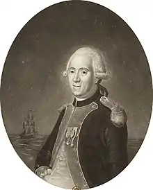 In December 1776, Philippe Charles Tronson de Coudray and a group of French officers left for America on the Amphitrite. The ship was soon forced to turn back to France.[2] Anxious to get on with their journey, Lieutenant du Plessis and Philippe Hubert Preudhomme de Borre went aboard the Mercure. Du Plessis paid 400 livres for the price of his passage. Carrying a secret cargo of military supplies, the vessel left Saint-Nazaire on 5 February 1777.[3] The Mercure reached Portsmouth, New Hampshire on 17 March and de Borre arrived at Morristown, New Jersey exactly two months later.[2] Appointed captain of artillery in the Continental Army, du Plessis' commission dated from 15 April 1777. He fought at the Battle of Brandywine on 11 September.[4]