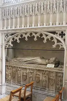 To Thomas Boleyn LL.D is attributed a fine tomb with recumbent effigy in St Calixtus's chapel, off the south transept of Wells Cathedral.[2] The monument is especially notable for its alabaster work including figures of canons in choir habits, and images of the Holy Trinity and the Annunciation. These latter presumably allude to his association with the colleges of Trinity Hall and Gonville Hall (The Hall of the Annunciation of the Blessed Virgin Mary). However, although evidently a Bolleyn tomb, this presents the difficulty that the heraldic arms shown on the tomb-chest are Argent,[71] fretty sable, on a chief of the same three plates, for the family of Boleyn or Bullen of Stickford, Lincolnshire, and not Argent, a chevron gules, between three bulls' heads couped sable, which were those of the Norfolk family.[72][73]