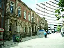 This is a grade II listed building,[92] designed by Sorby,[32][93] who was invited to a celebratory supper at the Royal Hotel, Barnsley, after the opening.[94] The courthouse originally fronted both Regent Street (no.22), and Eastgate, Barnsley, South Yorkshire, and was a new build at the behest of the Lords Commissioners of the Treasury, under whose auspices Sorby was architect. It was opened for court business on 1 December 1871. It was originally budgeted at £4,000 (equivalent to £396,235 in 2021),[20] but ultimately cost £7,000 (equivalent to £693,412 in 2021) for the build, or more than £10,000 (equivalent to £990,588 in 2021) including land and other expenses.[27][95] The Midland Railway Company had taken Barnsley's existing 1861 county court building by Charles Reeves as its station, for waiting rooms and a post office,[96] and paid some of the cost of Sorby's new court house on a nearby site, "two hundred yards higher up Regent Street". An article by Sorby, published in the Building News, describes it thus:[20]