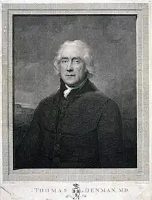 Thomas Denman, the elder, M.D. (17331815) was an English physician. He was the second son of John Denman (or Thomas[2]), an apothecary born at Bakewell, Derbyshire, on 27 June 1733. After a career in naval medicine he made a considerable amount of money in midwifery. The phenomenon of Denman's spontaneous evolution, by which a spontaneous impaction of the shoulder of a foetus resolves a difficult transverse delivery during childbirth, is named after him.[3] He used his authority to support inducing premature labour in cases of narrow pelvis and other conditions in England (where the mother's life is imperiled by delivery at the full-time).[1]