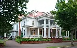 The Hoatson House is a 2+12-story wood-frame structure of Neoclassical design. The house is rectangular with a red sandstone foundation and clapboard exterior.[3] The front facade is symmetric, with a central portico with Corinthian columns sheltering the main entrance and a one-story porch to each side.[3] A hipped roof with gabled dormers sits atop the house.[11]