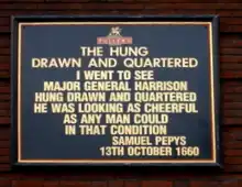 Samuel Pepys wrote an eyewitness account of the execution at Charing Cross, in which Major General Harrison was drily reported to be "looking as cheerful as any man could do in that condition". This account is also quoted on a plaque on the wall of the Hung, Drawn and Quartered public house near Pepys Street, where the diarist lived and worked in the Navy Office. In his final moments, as he was being led up the scaffold, the hangman asked for his forgiveness. Upon hearing his request Thomas Harrison replied, "I do forgive thee with all my heart... Alas poor man, thou doith it ignorantly, the Lord grant that this sin may be not laid to thy charge." Thomas Harrison then gave all of the money that remained in his pockets to his executioner and was thereafter executed.