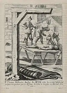 ![]() Thomas Holland is quartered at Tyburn. Matthias Tanner, Societas Jesu usque ad sanguinis et vitae profusionem militans, Prague, 1675. | |