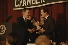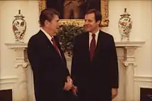 In the 1981 general election, Kean defeated Democratic Representative Jim Florio in the closest election in New Jersey gubernatorial election history, winning by 1,797 votes.[2] The election was controversial due to the involvement of the Republican National Committee, who appointed a Ballot Security Task Force that was alleged to have intimidated voters.[11][12][13] One of Kean's strategists in his 1981 campaign was Roger Stone, a self-proclaimed "GOP hitman."[14]