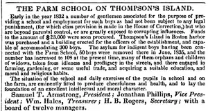 In 1833, the Boston Asylum for Indigent Boys was moved to the island, and in 1835 it merged with the Boston Farm School Society to become the Boston Asylum and Farm School for Indigent Boys. Many of the students who went to school on the island lost one or both parents, or had parents who were unable to care for them.[5] In order for a student to be enrolled in the school, the parents or guardians had to sign a form giving the school guardianship of the boys until they were 21 years old.[6] While on the island, parents were only able to see their child once a month during visit days and for two weeks during the summer when the boys were allowed to return home.[7] Many "distraught mothers" [7] changed their minds about having their boys at the school and wanted to have them withdrawn. There are several documented cases where the school returned guardianship to the parents, who were then able to have their child come back home.[8]