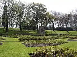 The park also contains a memorial, erected shortly after it opened, commemorating Dr James Mackenzie, a pioneering Scottish cardiologist who spent over 25 years as a general practitioner in the town. The memorial consists of a bronze bust by L. F. Roslyn set in a pink granite niche in a sandstone wall with stepped sides and top. The niche is round-headed with a bronze garland around the top, and with the life-sized bust standing on an inscribed pedestal.[10]