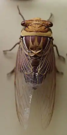 The northern double drummer is a large species of cicada, the second largest in Australia,[1] just smaller than the largest species, the double drummer. The male and female average 4.56 cm long. The thorax is 1.85 cm in diameter.[2] The eyes are light brown tinged with purple,[2] and the postclypeus dark red-brown. The head is variable in colour, but never black like the double drummer.[1] The thorax is brown with lighter golden-brown markings.[2] The mesonotum is brown tinged with purple. The underside of the thorax is red-brown and covered in fine silvery velvety hairs. The abdomen is dark brown, with the first and second segments above and underside covered with grey hairs, and also a whitish pregenital band of hair. The wings are vitreous (transparent) with light brown veins. The legs are brown and have fine grey velvety hairs.[2]