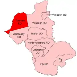 52°35′13″N 0°06′32″W / 52.587°N 0.109°W / 52.587; -0.109 Thorney was a rural district in England from 1894 to 1974, situated to the east of Peterborough.
